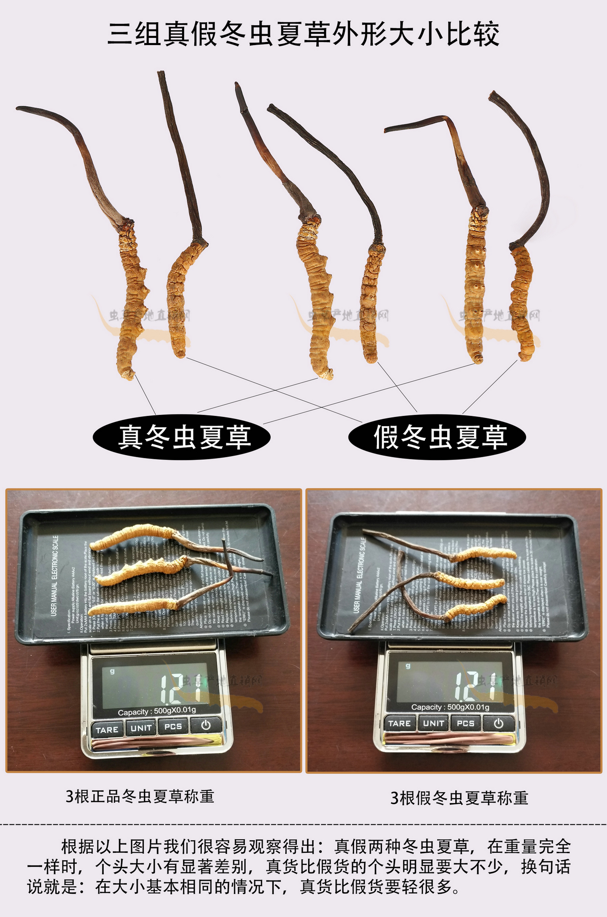 以上圖片,將這種產(chǎn)自四川和云南、極易被不法商家用來冒充正品的假冬蟲夏草與真冬蟲夏草的外形特征區(qū)別,介紹得非常清楚,相信大家在認真看過之后,就能避免買到這種假蟲草了。